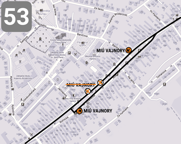 - zastávku MiÚ Vajnory (A) obslúži v náhradnej polohe pred križovatkou Roľnícka × Baničova.