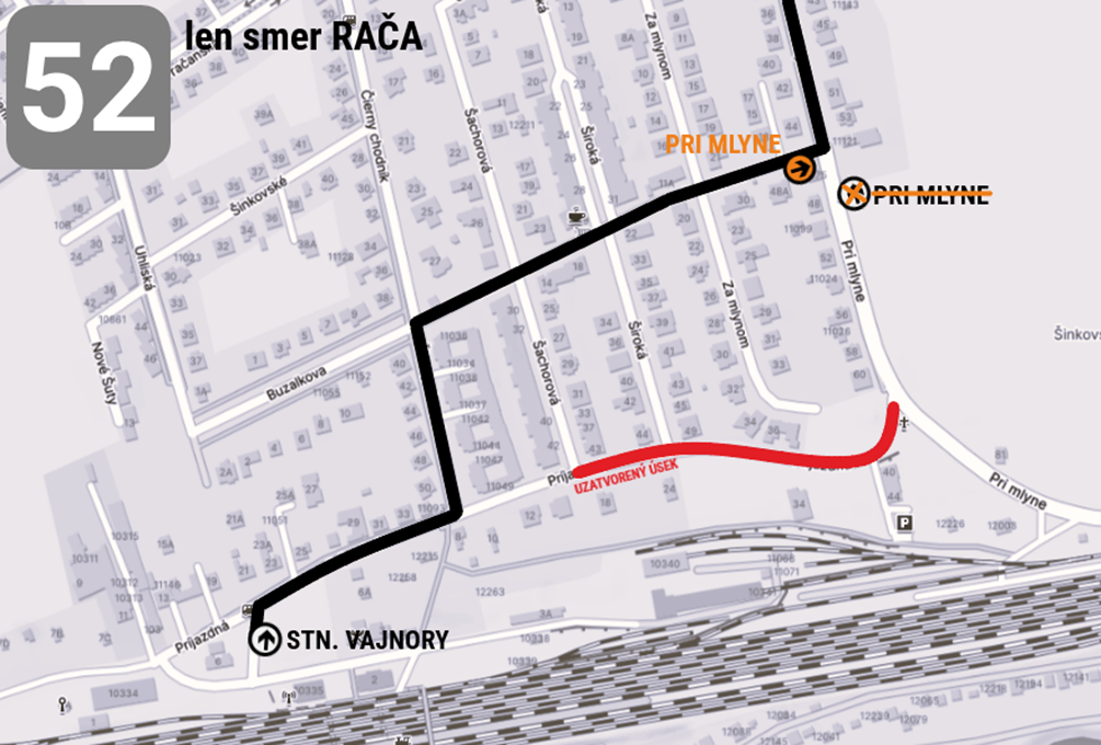 Linka 52 bude v smere TBILISKÁ/POTOČNÁ medzi zastávkami Stn. Vajnory – Pračanská premávať obchádzkou cez ulice Príjazdná, Čierny chodník, Buzalkova a Pri mlyne.