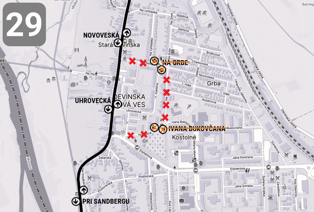 Dočasné neobsluhovanie zastávok Ivana Bukovčana a Na Grbe - linka 29