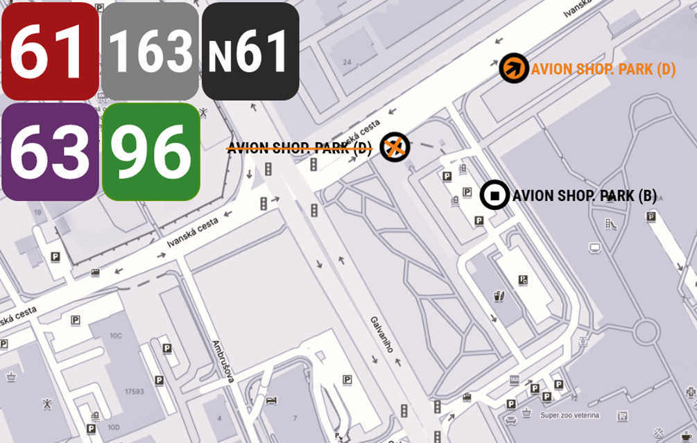 Linky 63 a 96 neobslúžia zastávku Avion Shop. Park (D) ► Avion Shop. Park; obslúžia až výstupište Avion Shop. Park (B).