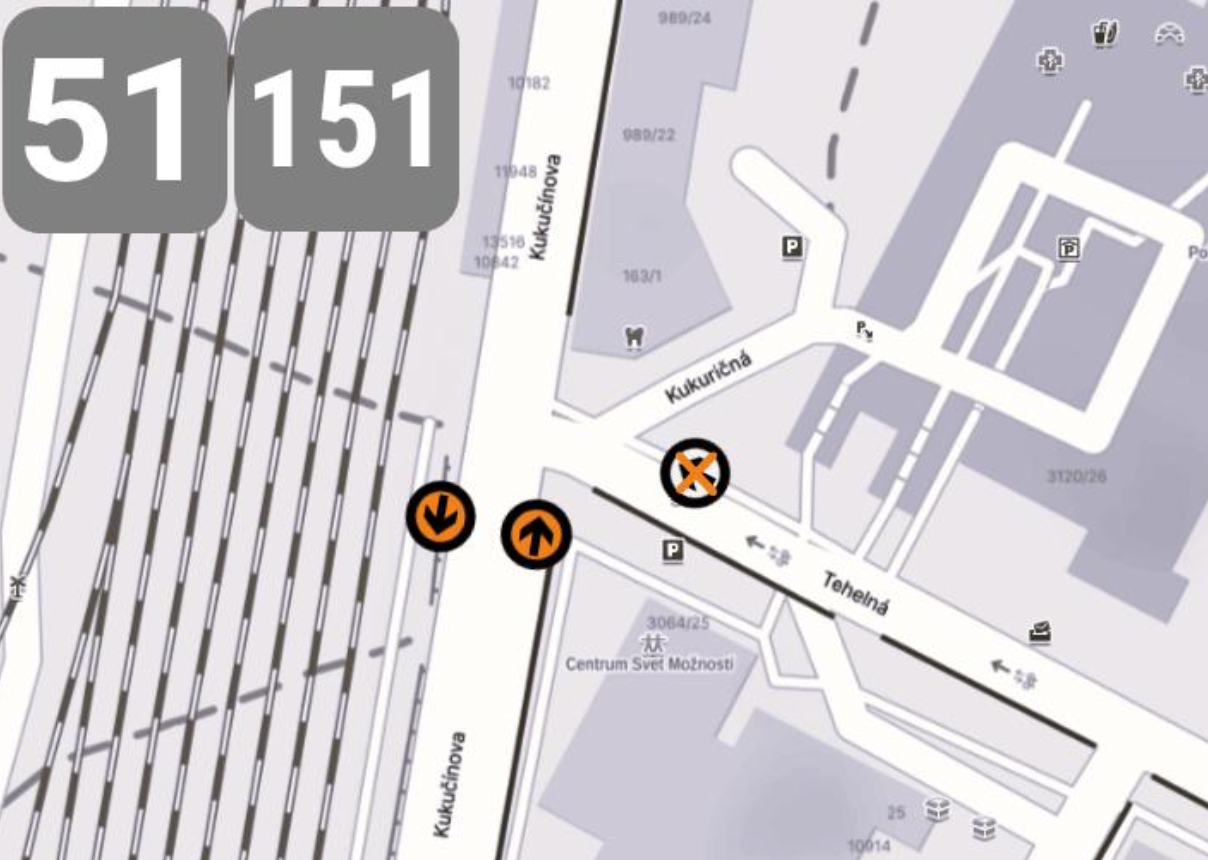Dočasný presun zastávky Tehelná - linky 51 a 151 7. 5. 2025 - 16. 5. 2025 Z dôvodu havárie vodovodu linky 51 a 151 obsluhujú zastávku Tehelná v náhradnej polohe na Kukučínovej ulici, v blízkosti križovatky s Tehelnou ulicou.