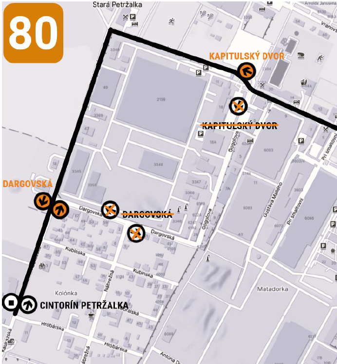 Od 25. októbra 2025 (sobota) od začiatku dennej premávky do 31. októbra 2025 (piatok) do konca dennej premávky budú z dôvodu havárie vodovodu obojsmerne neprejazdné ulice Gogoľova a Dargovská pre autobusy linky 80. Určené spoje premávajúce k Cintorínu Petržalka budú medzi zastávkami Stn. Petržalka a Cintorín Petržalka premávať obojsmerne po Úderníckej a Kaukazskej.
