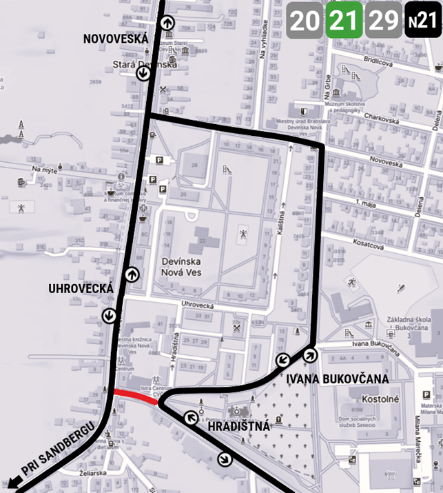 Medzi zastávkami Hradištná a Novoveská/Pri Sandbergu premáva cez Hradištnú, Na Grbe, Novoveskú a Istrijskú.